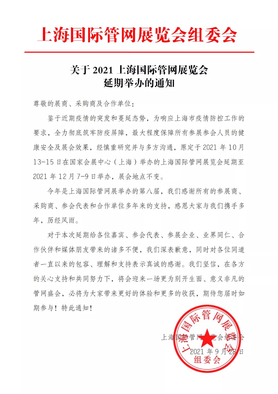 【延期通知】關于2021上海國際管網(wǎng)展覽會延期舉辦的通知…