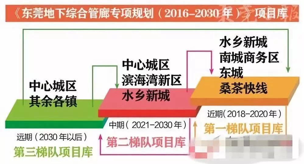 《管廊規劃》建議,南城和濱海灣新區可結合新區開發全面建設綜合管廊;莞城、東城、水鄉新城、謝崗(粵海銀瓶合作創新區)、寮步、虎門、厚街、松山湖(生態園)、大嶺山、大朗和塘廈可選擇近期重點建設區域同步實施綜合管廊,待遠期時機成熟再結合規劃建設需求進行建設;茶山、萬江、石龍、沙田、麻涌、中堂、望牛墩、洪梅、道滘、高埗、石碣、常平、東坑、橋頭、企石、橫瀝、石排、清溪、鳳崗、樟木頭和黃江建議確實有具體項目需要建設綜合管廊的,經科學論證分析后實施。