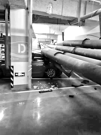 從爆料人的圖片來(lái)看,地下停車場(chǎng)上方四根直徑約50 厘米管道,共同發(fā)生了崩塌,發(fā)生崩塌的長(zhǎng)度至少在20 米以上。原本位于管道下方的數(shù)輛私家車直接被砸中而受損。