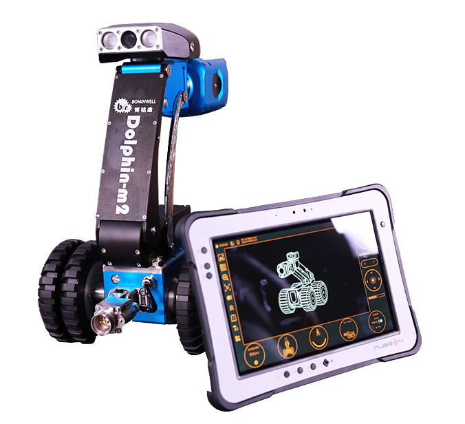 Dolphin-M2 多功能管網機器人由專用觸控終端、線纜車和機器人爬行器三部分組成。Dolphin-M2擁有更人性化的使用方式,小型化輕量化的三防平板控制終端,終端與線纜車之間采用wifi無線傳輸技術,配合無線手持式操作手柄,使用非常方便。