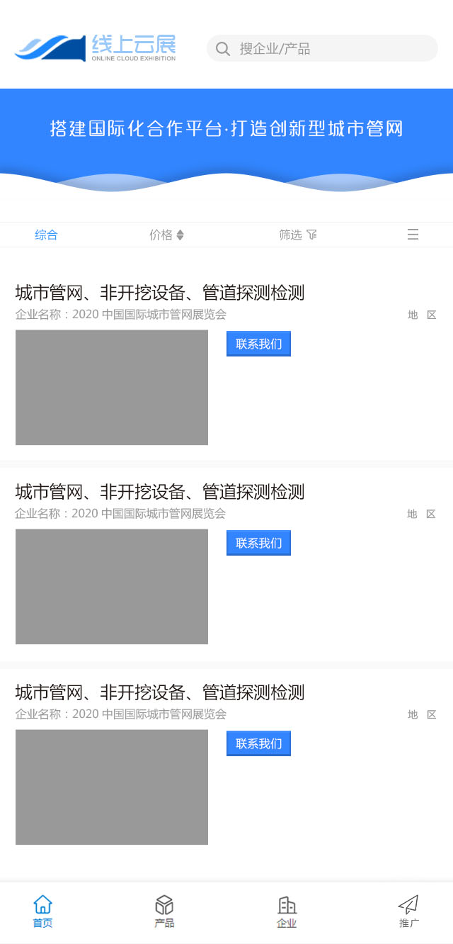“線上云展”——設置管網探測與檢測、管道與管材產品、車輛及疏通設備、非開挖設備修復、智慧管網與水務、污泥與污水處理、道路空洞與病害、燃氣熱力管應急、管廊及海綿城市及企業專屬海報等版塊,實現零距離展示、溝通,做到無障礙、無時差營銷;根據企業產品特點,精準匹配市場需求、挖掘新客戶,為企業搭建良好的供求貿易平臺,在全球市場上贏得商機、提高效益。