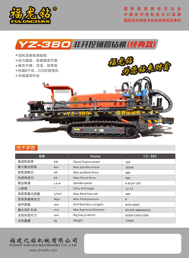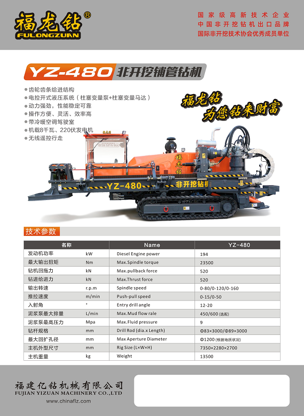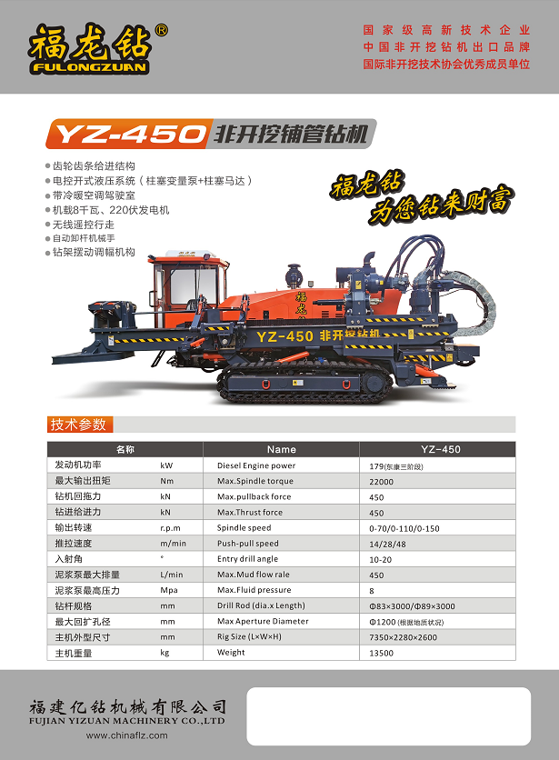 YZ系列水平定向鉆機主要用于在非開挖地表的條件下,鋪設及更換各類地下管線,該機性能先進、工作效率高、操作舒適,關鍵部件采用國際化配套,是供水、排水、電力、通信、天燃氣等行業的新管道建設和舊管道修復施工的理想設備。目前,公司“福龍鉆”牌非開挖水平定向鉆機產品暢銷福建、廣東、江西、湖北、海南、上海、浙江、蘇州等全國各地,并出口馬來西亞、泰國、菲律賓等東南亞國家和地區。