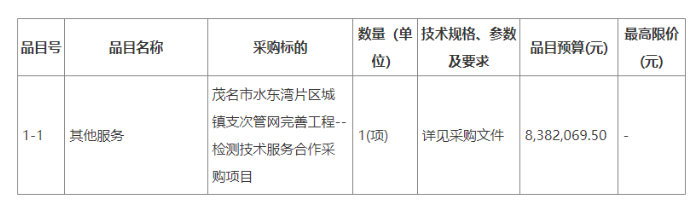 合同包1(茂名市水東灣片區城鎮支次管網完善工程--檢測技術服務合作采購項目):