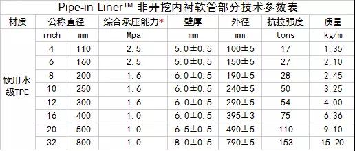 Pipe-in Liner? 非開挖內襯軟管部分技術參數表